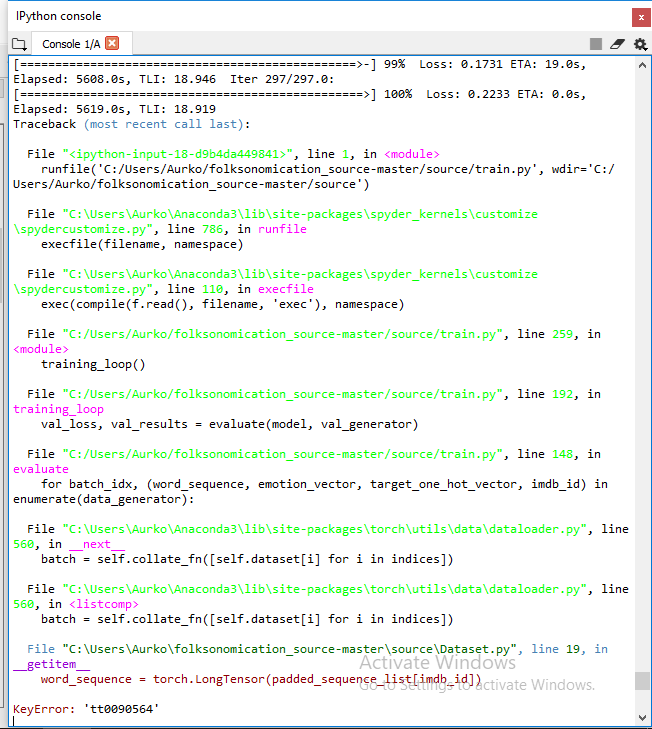 After running the train.py file and after completing all of its iterations for training, this error shows up telling KeyError: 'tt0090564' while executing line 19 of Dataset.py file. I think it cannot find a particular movie ID in a JSON file or some other issue that I don't know.