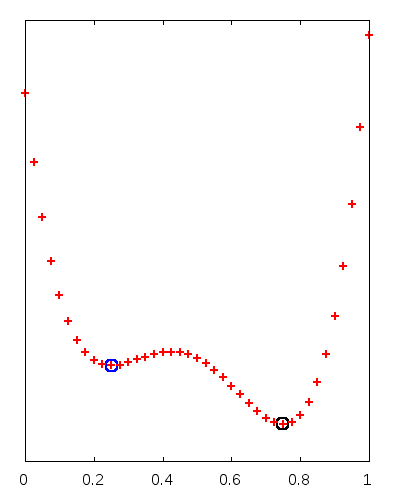 Let us first consider a simple one-dimensional example, shown in figure 1. There is a single parameter, given by the x-axis, which ranges from 0 to 1. The energy as a function of this parameter is plotted. A simple way to find the minimum value of the energy is to calculate its value for a range of values of the parameter, as shown in figure 2. This is known as a grid search. We can then see that the black circle is the location of the minimum. However, we recall that we would like to make as few evaluations of the energy as possible, and so we might wonder if we could have found the minimum without sampling the parameter so finely everywhere, perhaps by using previous energy evaluations as a guide. On the other hand, taking too few measurements can lead to converging to the wrong location. For example, if we had only sampled parameter values less than approximately 0.4, we might have thought that the blue circle was the minimum. Such a point is known as a local minimum whilst the overall minimum value is known as the global minimum.