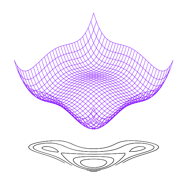 Figure 4. The two-dimensional function also illustrated in figure 3 but with the energy value given by the surface height. The surface is being viewed from the (1, 1) direction. The global minimum can be seen at the front, where the surface is lowest. |