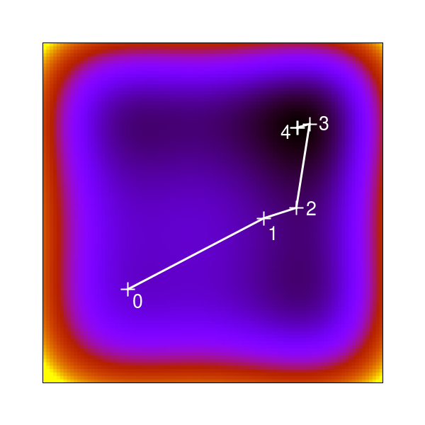 This method is illustrated in figure 7. The starting point is the white cross on the left hand side, labelled “0”. The arrow shows the direction of steepest descent. In figure 8, the energy as a function of distance along this direction is shown, with the cross showing the point that was chosen to be the new location. Clearly the true minimum along this direction was not found; however, only a handful of function evaluations were required to find the point and it is considered sufficiently good. The new point is labelled “1” in figure 7. The full optimisation from this starting point is shown in figure 9, and we can see that it reaches the global minimum after five iterations. However, in figure 10, we show the same process from a different starting point and can see that this time the method converges to one of the local minima.