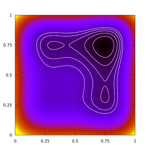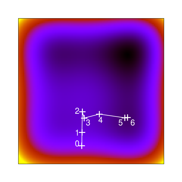 We will now consider a two dimensional example, illustrated in figure 3. Both parameters range from 0 to 1. The energy as a function of the two parameters is shown by the colour, with the dark purple colour indicating the lowest energy values. The white lines are contours along which the energy has a constant value. The global minimum is located at and there are local minima at