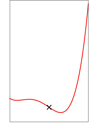 | Figure 7. An illustration of the first stage of a gradient descent optimisation. The cross labelled “0” is the starting location of the method, with the arrow indicating the direction of steepest descent. The point labelled “1” is the position along this direction that is chosen to be the starting point of the next algorithm iteration. | Figure 8. The energy as a function of distance along the direction of steepest descent indicated in figure 7. The cross indicates the distance along this direction of the position of the next point. This is the point labelled “1” in figure 7. |