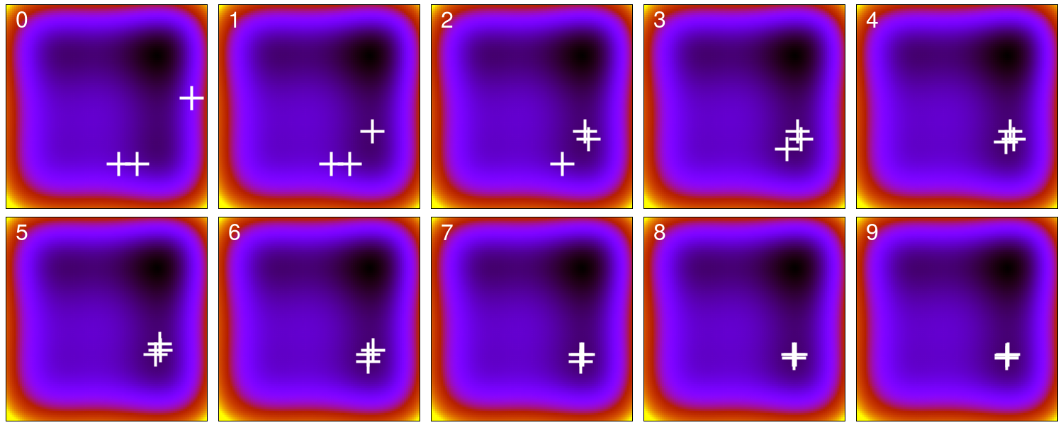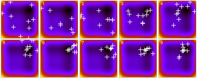 Particle Swarm Optimisation is an example of a metaphor-based metaheuristic. It was originally intended for simulating social behaviour, representing the movement of birds or fish, but was found to move across a parameter space in a useful manner. The particles search the space in a partly random manner and partly guided by the best locations found by the individual particles and by the swarm as a whole. The method can search large parameter spaces and is good at finding global minima, but there are no guarantees on its performance due to its heuristic nature. An example of how the particles move over our two-dimensional function is shown in figure 11.