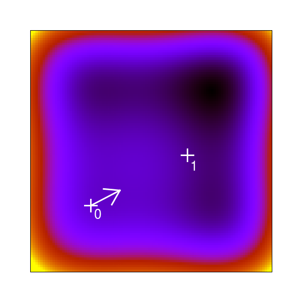 | Figure 3. A two-dimensional function of which we wish to find the minimum. The value of the energy is shown by the colour, with the darker colours being lower energy values. The white lines are contours along which the energy has a constant value. The global minimum is located at |