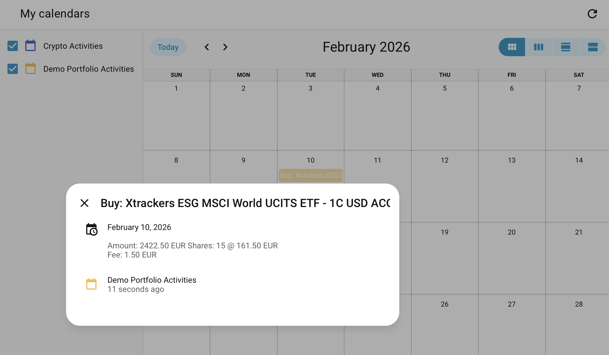 Each portfolio creates a calendar entity (calendar.<portfolio>_activities) that exposes transactions as calendar events. View them in HA's built-in Calendar view or use them in automations.