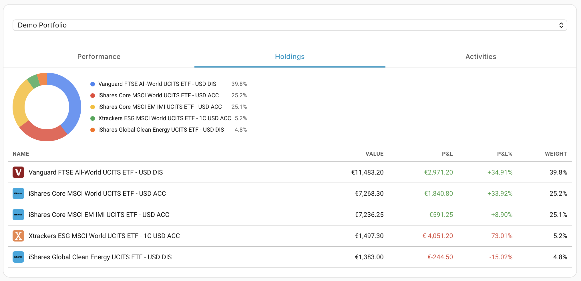 Holdings — Donut allocation chart (top 20 + "Other" bucket) and a sortable table with logos, P&L, and weights.