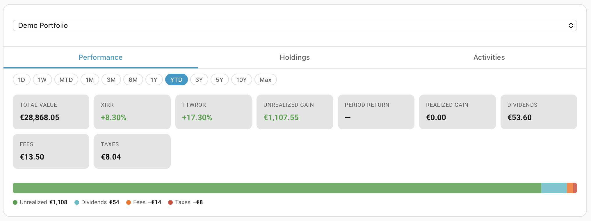 - 22 sensors per portfolio — total value, XIRR, TTWROR, unrealized/realized gains, dividends, fees, taxes, allocations, and more