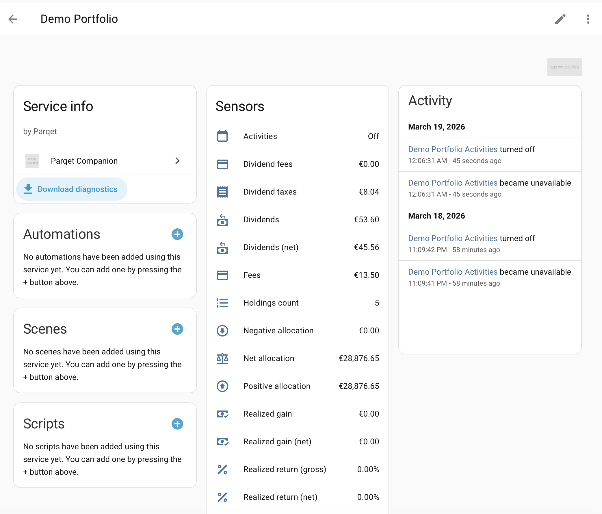 | Sensors show "unavailable" | Check that your Parqet OAuth token hasn't expired; re-authenticate in integration settings |