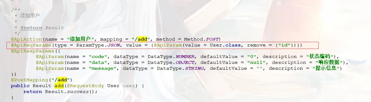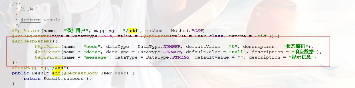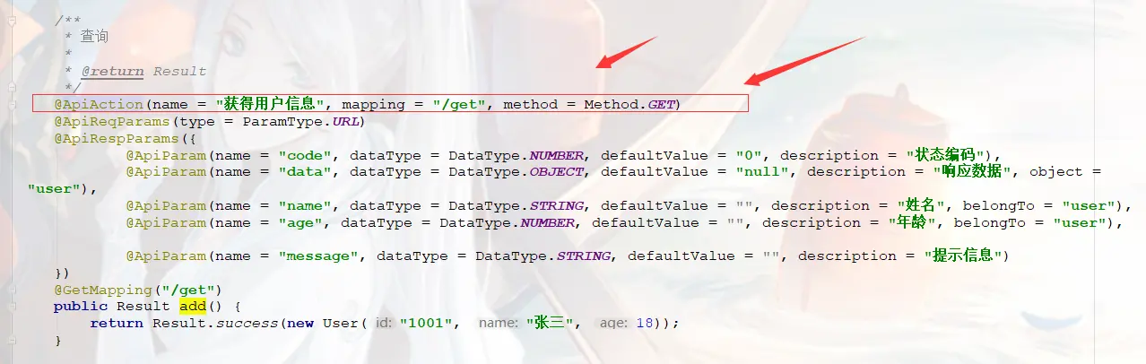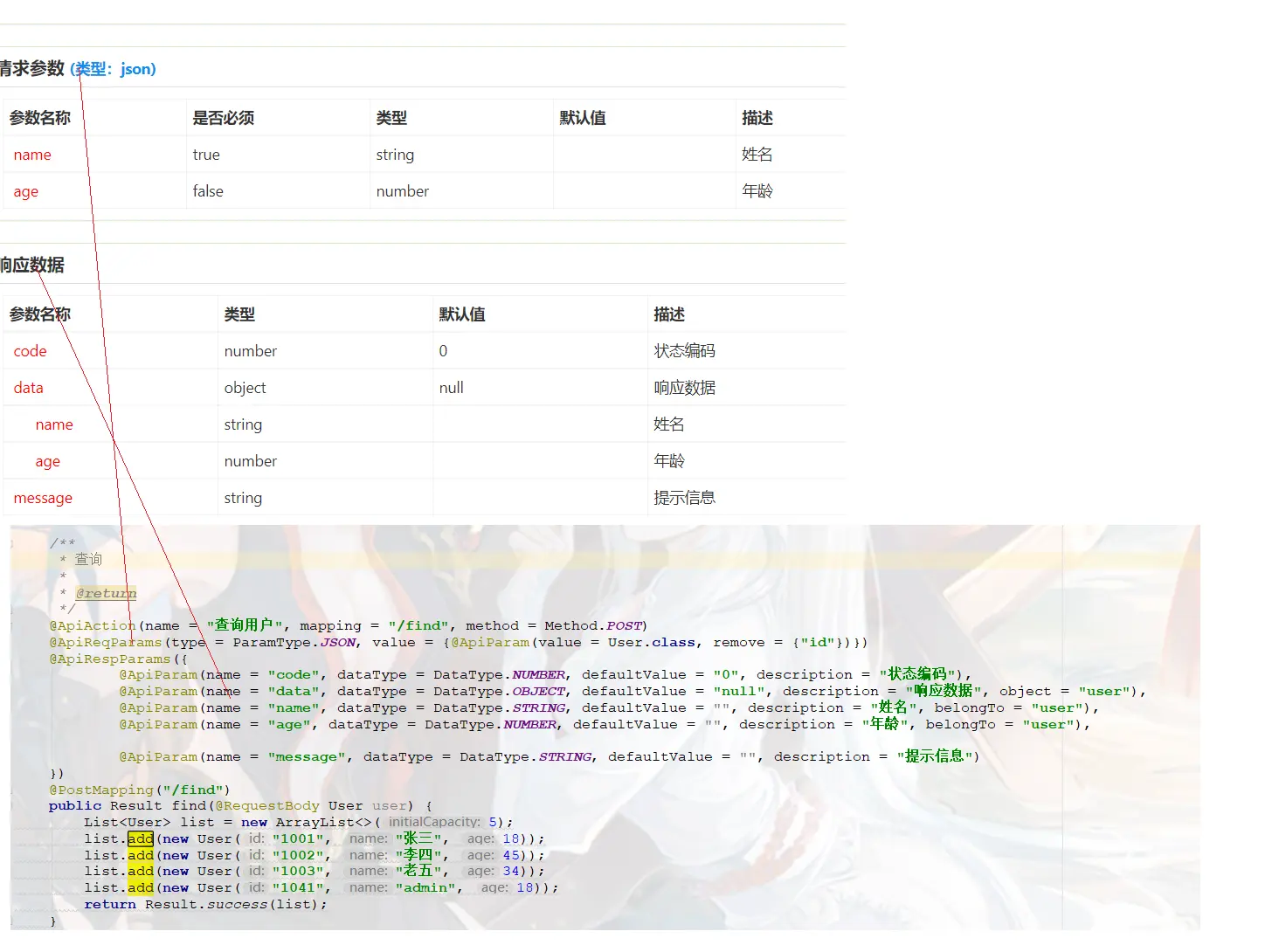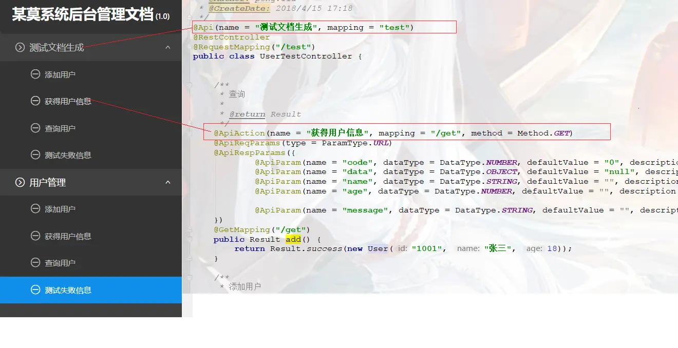 一个详细例子如下代码,这里是springboot/springmvc的controller示例(展示两个文档,前端接口和后台接口)参考代码这个类 UserController.java