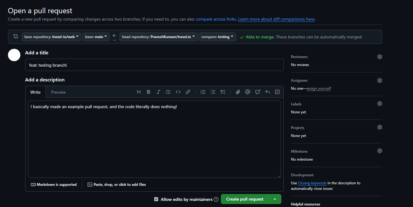 That is it for contributing! Again, you need to pull changes, create a new branch with the branch name being what feature you are going to work on, code whatever you need to, push changes to GitHub, then create a pull request!
