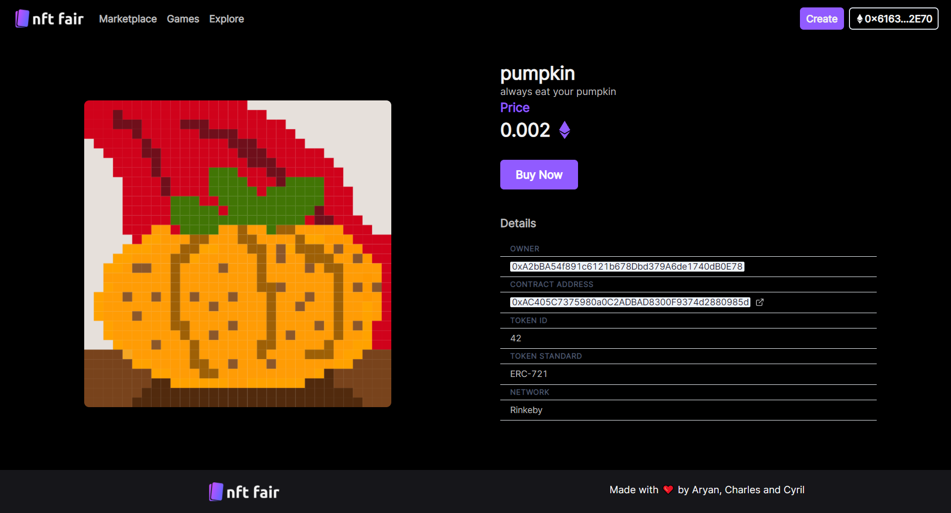 Really proud to present before you, NFT-Fair , a place to forget about the complexities of NFTs and just play around with them. Create, buy, sell, earn and even play with the NFTs. This is the one true stop shop for NFTs. Applause for the awesome people at thirdweb, whose product made this project possible.
