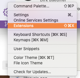 Extensions can make it easier to work within the editor. Open the extensions browser by clicking the Settings Icon in the lower left of VSCode and choosing Extensions, or, as you can see, it has a shortcut.