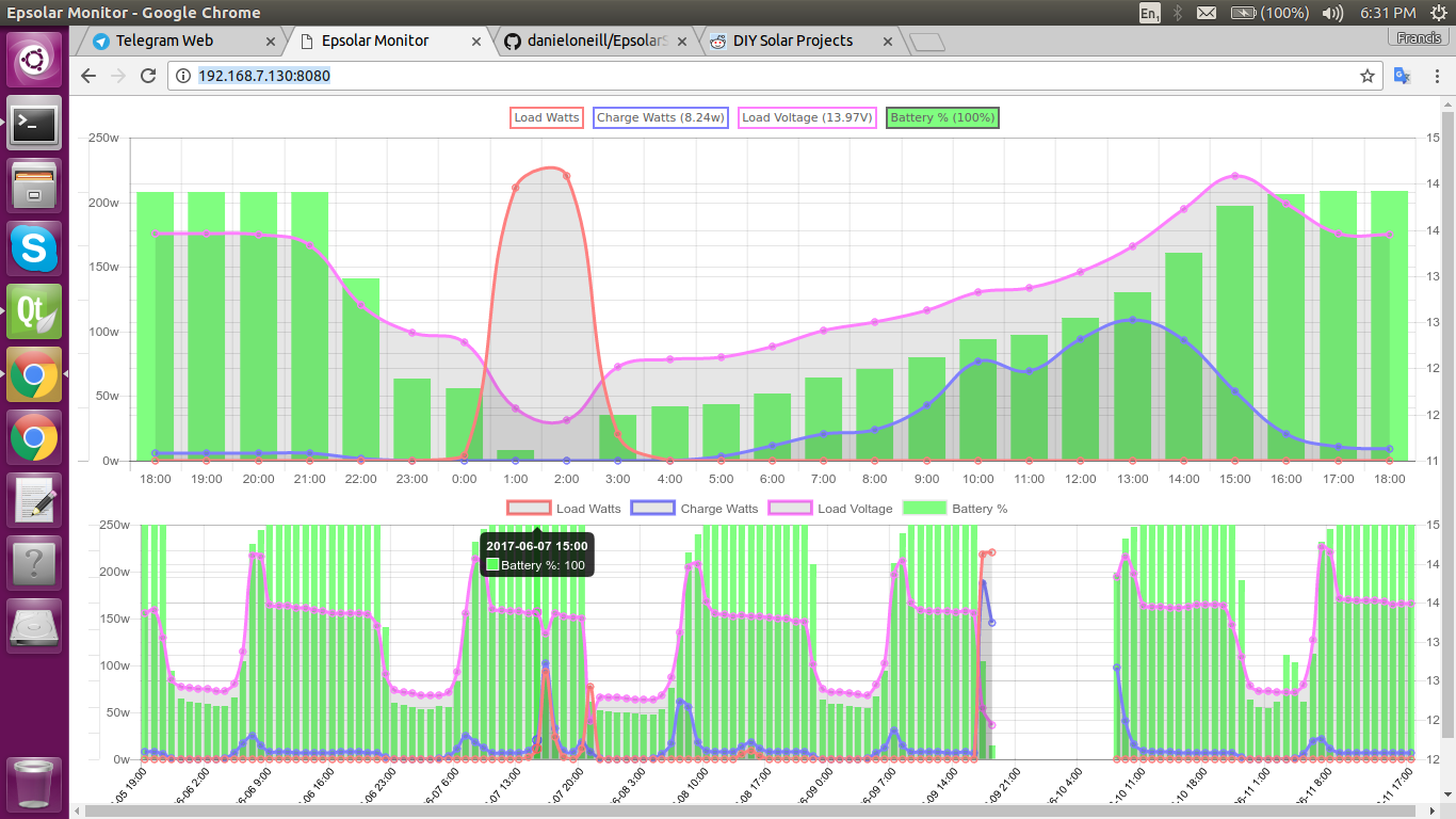 Any gaps of white in the graph indicate that the EpsolarServer program wasn't running for that period, such as a power outage or battery bank maintenance, or the disk is full and no additional records can be saved.