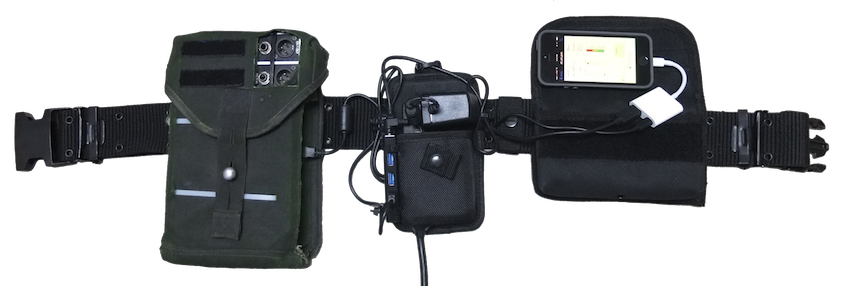 With PdParty, the author now has a stable low latency mobile/wearable platform with a touchscreen, accelerometer, WiFi networking, and USB MIDI/audio. Here is a belt-based wearable setup using an iPhone, Camera Connection Kit, powered USB hub, Roland Edirol UA-25 USB audio interface, and a Behringer direct box (the latter two are built in the case on the left):
