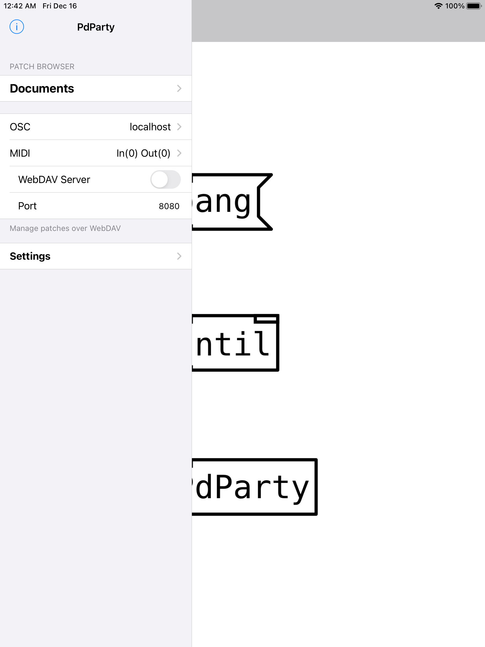 PdParty is an iOS app that allows you to run Pure Data patches on Apple mobile devices using libpd. It is directly inspired by Chris McCormick's PdDroidParty and the original RjDj app by Reality Jockey. It takes a step further by supporting OSC and MIDI and by implementing the native Pd gui objects for a WYSIWYG patch -> mobile device experience: