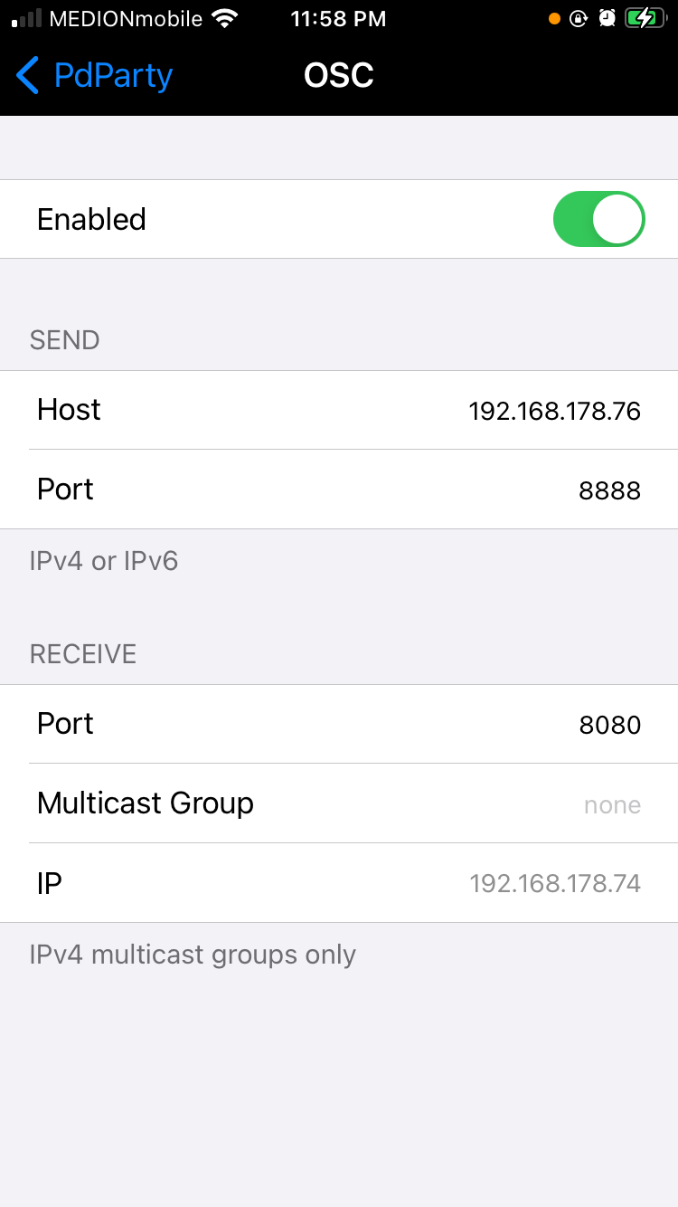 Enable the OSC server and update its send and receive settings: ports, host (destination address), etc. The network IP address of the device itself is shown so you know where to send OSC messages to from another device. The server supports both IPv4 and IPv6.