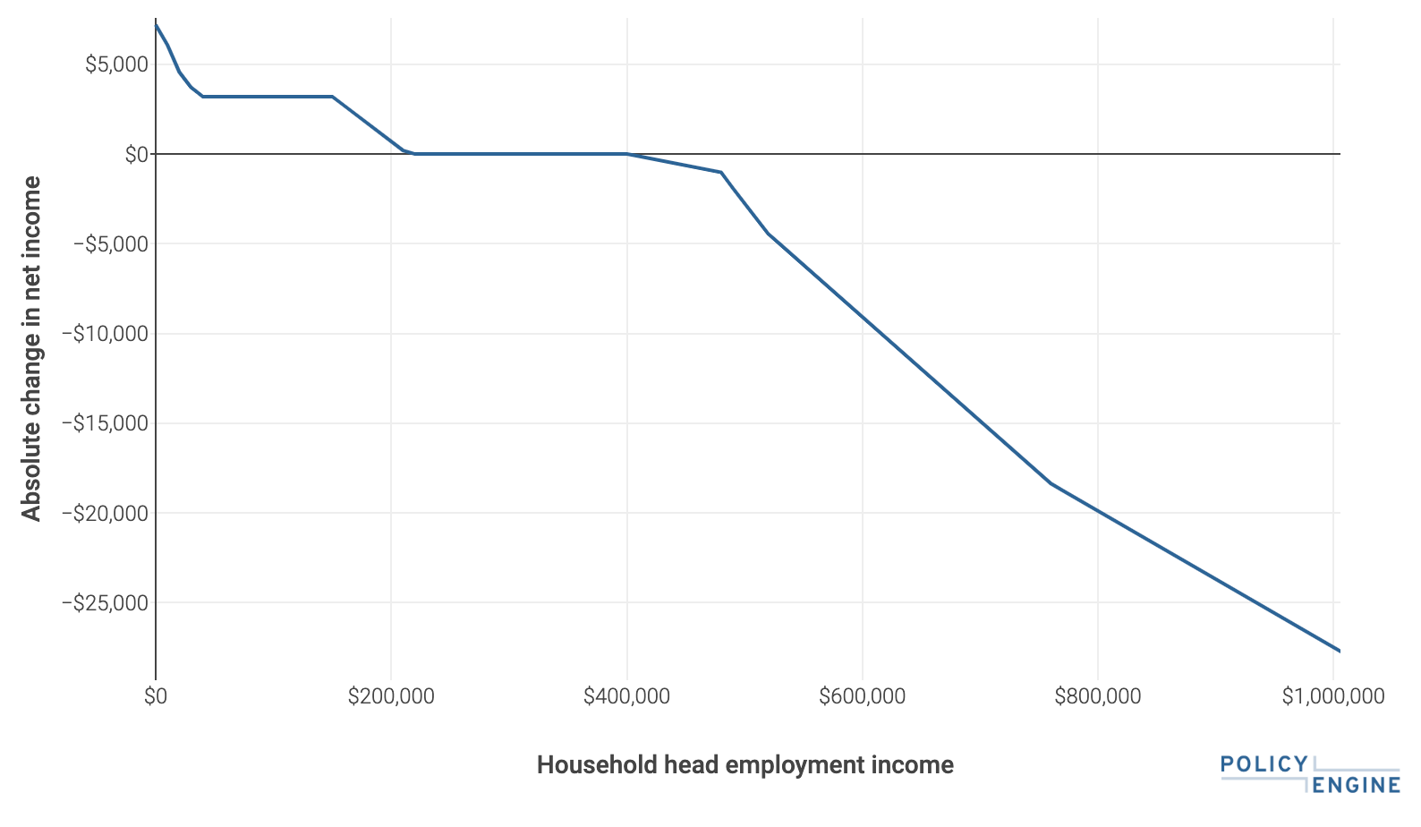 The single person would see a larger EITC at low incomes, then a tax increase when their wages exceed $400,000, reaching a $26,600 total impact at $1 million earnings.