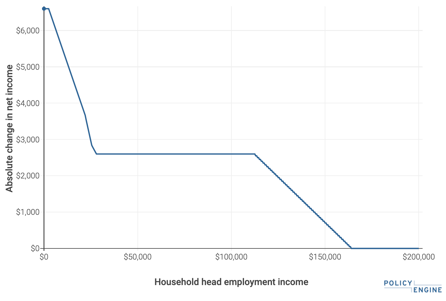 For example, this reform would provide an additional $3,600 to a single parent of two children, with one below six, if their income is below $6,600. The net benefit would phase out until their earnings reach $164,000, as shown here.