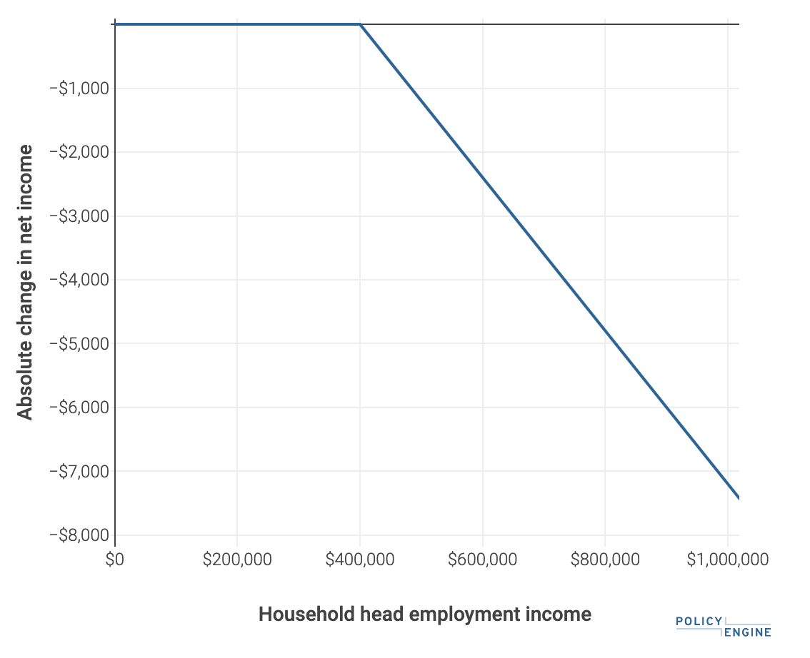 For a single person without itemized deductions, taxes would begin rising at $414,600 ($400,000 plus the standard deduction), and reach $19,400 in additional taxes at $1 million earnings.