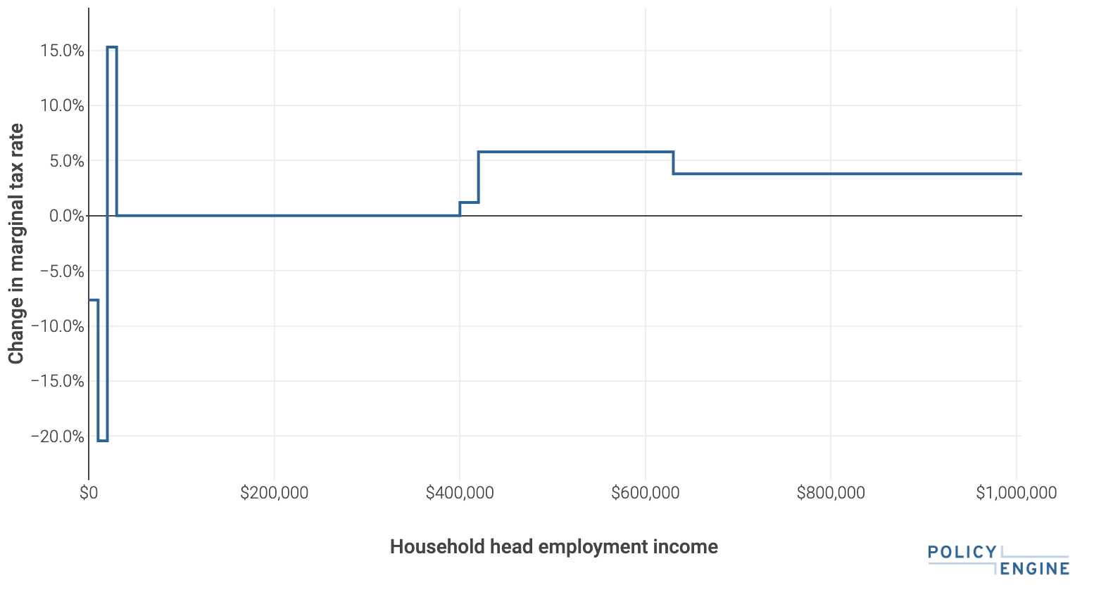 The reform increases their marginal tax rate, due to making the CTC fully refundable (removing the phase-in that reduces marginal tax rates), phasing out the additional CTC benefit for higher earners, and the high-income tax increases. The marginal tax rate increase stabilizes at 3.8pp for earnings above $770,000.