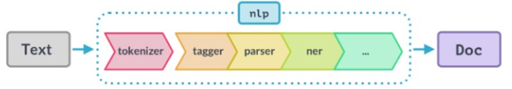 使用spaCy时,文本字符串的第一步是将其传递给NLP对象。这个对象本质上是由几个文本预处理操作组成的管道(什么是Pipeline),输入文本字符串必须通过这些操作。当你在一个文本上调用nlp时,spaCy首先通过Tokenizer(分词器)进行分词并生成一个doc对象,然后doc会经过几个不同的步骤进行处理。Pipeline通常包括一个标记器(tagger)、一个词法器(lemmatizer)、一个解析器(parser)和一个实体识别器(entity recognizer)。每个流水线组件都会返回经过处理的doc,然后将其传递给下一个组件,最后形成最终doc。
