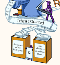例如在以下这个部分,创作者并非简单地讲述自己如何从书本中提取每个人的身体部件和用以形容这个部件的形容词,而是将其具象化为两个盒子,而自己利用机器从书中加工提取。这与传统的可视化风格不同,创作者没有使用复杂的3D等技术使之变得立体化,而是使用手绘漫画的形式,为整篇文章增添了趣味性。