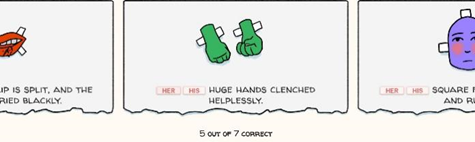 比起使用文字,创作者更偏好将读者拉入到创作中去。在这里,作者邀请读者进行答题。读者在答题过程中接收到有关不同形容词去描述两性身体部件的信息,下方显示了读者答题的正确率,能够激起读者的好胜心,读者为了提高正确率则需要认真仔细地阅读题目中文字。这样的互动过程提升了参与感,也使读者对文章内容有更深刻的理解。