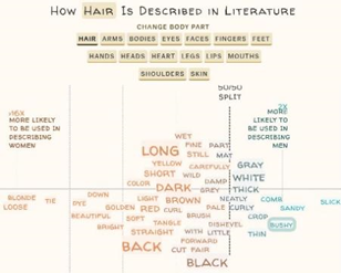 此外,作者该将该数据创造性地转移到坐标轴中。以下图为例,图中的坐标图表示头发这个身体部件在文学作品中是被怎样描述的。更多地被用于形容女性头发的形容词设置在y轴的左边,颜色为橙色;更多地被用于形容男性头发的形容词设置在y轴的右边,颜色为蓝色。每个词的大小表现了是它在书本中的出现率,这个词越大,那么它在作者分析的书中出现的频率就越高。作者将坐标轴与词频表示相结合,以大小来表示词语出现频率,对于读者来说,阅读更加顺畅,也更易理解。