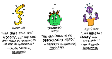 为了给整篇文章和议论的话题增加趣味性,创作者制作了各种各样的图案组合以夸张地表现书本中对人体部位的描写。以下的图像都是作者根据书中文字进行的漫画创作,可以看出这些带有刻板印象的描述被刻画到现实中会变得及其不自然。创作者以此为读者带来更大的视觉冲击感。