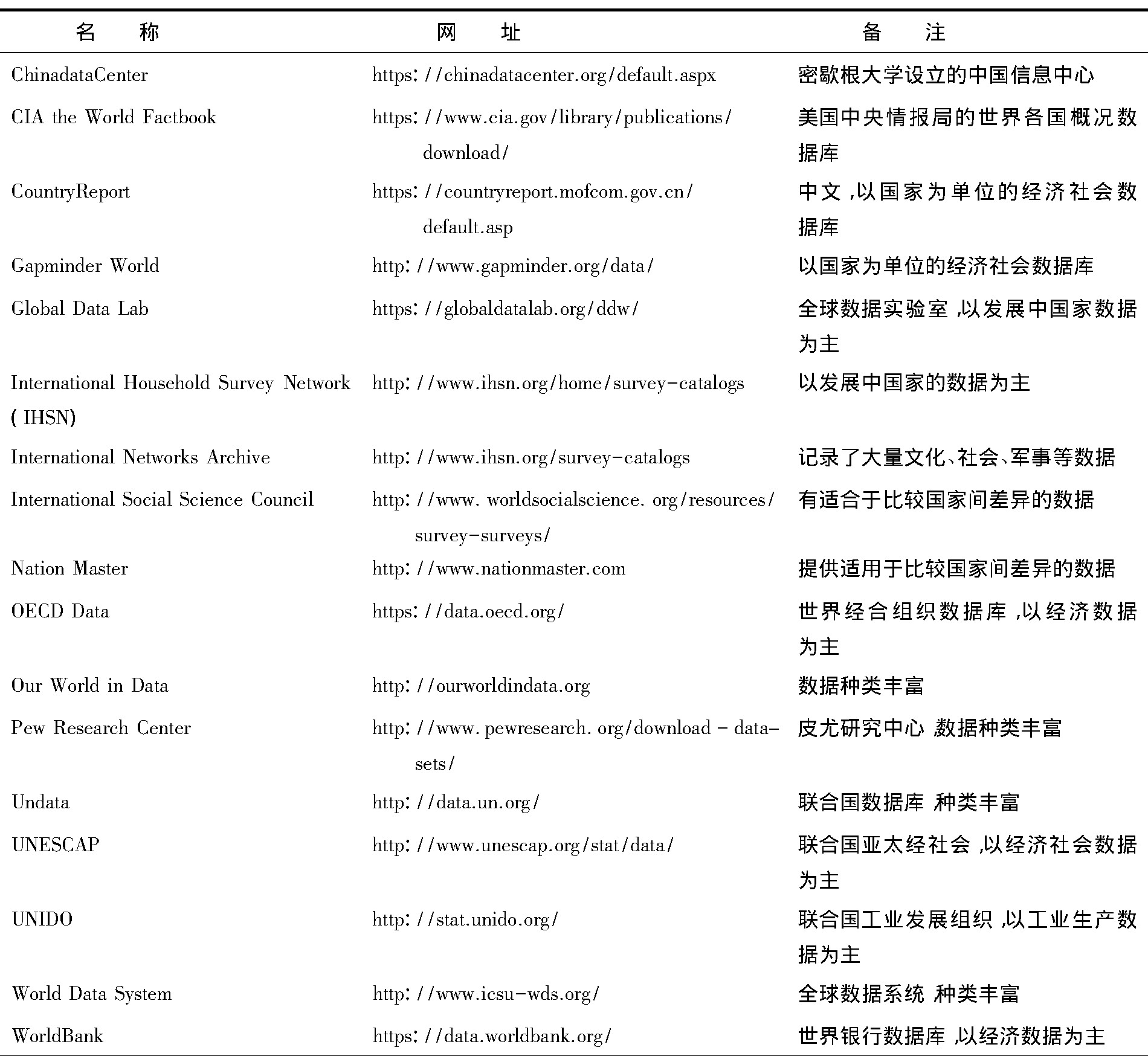 密歇根大学设立的中国信息中心 美国中央情报局的世界各国概况数 据库 中文,以国家为单位的经济社会数 据库 以国家为单位的经济社会数据库 全球数据实验室,以发展中国家数据 为主 以发展中国家的数据为主 记录了大量文化、社会、军事等数据 有适合于比较国家间差异的数据 提供适用于比较国家间差异的数据 世界经合组织数据库,以经济数据 为主 联合国数据库,种类丰富 联合国亚太经社会,以经济社会数据 为主 联合国工业发展组织,以工业生产数 据为主 全球数据系统,种类丰富 世界银行数据库,以经济数据为主 |