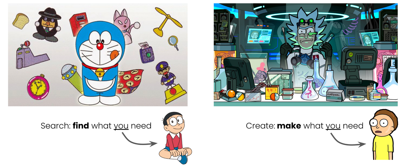 左:多模态人工智能框架下的搜索与创造的二元性右:《异形:契约》电影海报类似于哆啦A梦和瑞克,他们都拥有令人羡慕的超能力。但他们的不同在于哆啦A梦在他的口袋里寻找现有的物品,而瑞克则从他的车间创造了新东西。