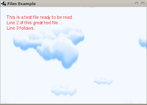 Running the following code will result in a window with a the clouds.png as the background, and overlaying the text read from the mytext.txt file.