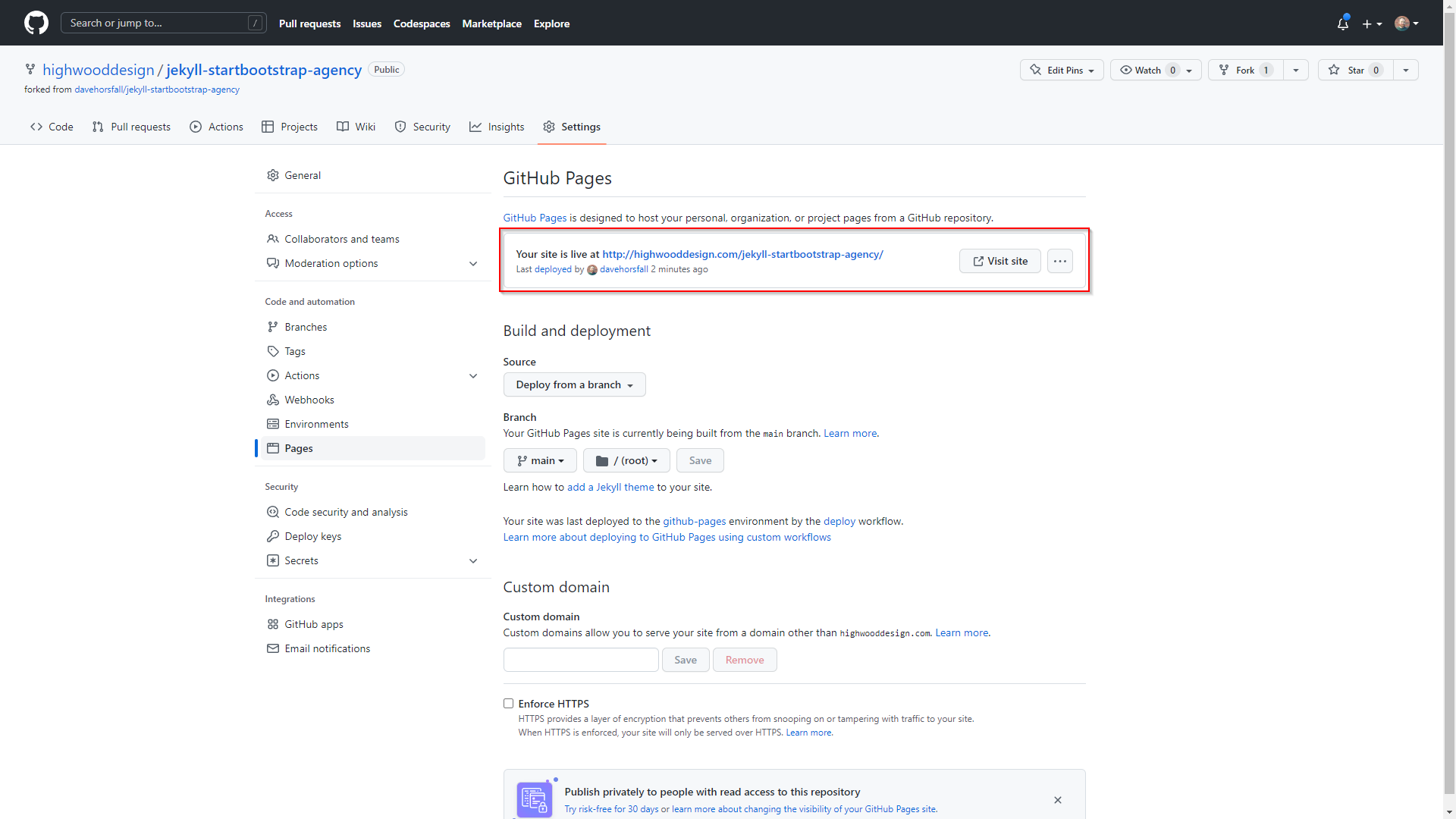 deployAction has successfully complete, you can return to thePageslink, to see a confirmation that your Jekyll website is live, along with a link to the website. You can make furhter changes to your Github Pages setup. For example, enforce HTTPS, or setup a custom domain. See the Pages documentation for more details.