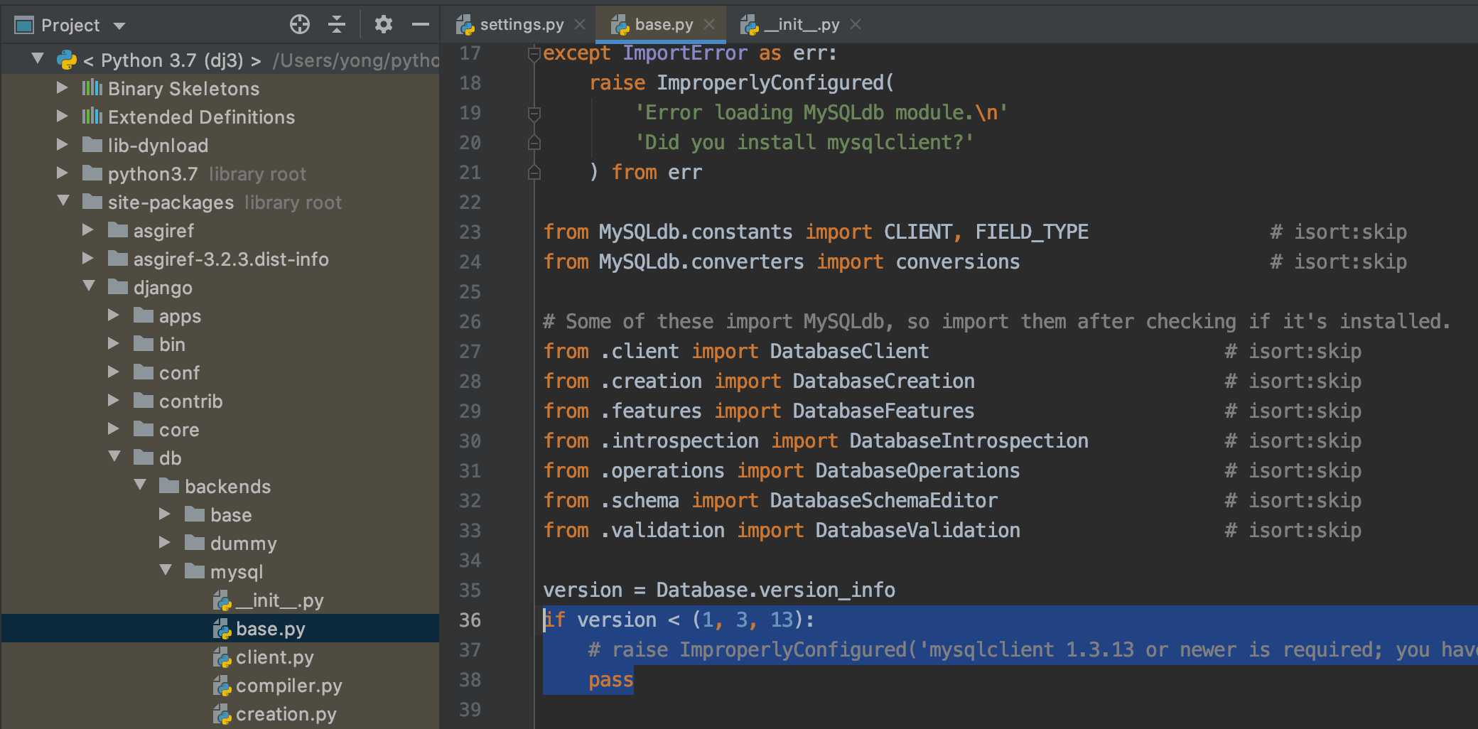 File "/Users/yong/python-envs/dj3/lib/python3.7/site-packages/django/db/backends/mysql/base.py", line 37, in <module>