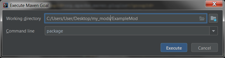 Type in package and hit execute! A jar file with your mod will be created in the directory specified by the pom.xml.