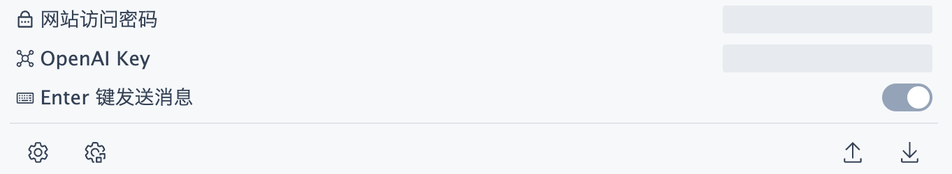 现在支持了多个对话,也就是多个聊天。不同的对话可以单独设置,也有不同的链接,标题,图标。所以现在有了两个设置按钮,第一个是全局设置,可以填写密码,API Key,也可以关闭 Enter 键发送,这样在手机上也可以换行。