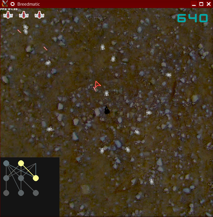 The brain takes in signals from the two topmost circles: angle to nearest baddie, time alive. The signal passes along connections from top to bottom to neurons, and the final circles-neurons at the bottom result in the output signals: angle of the weapon, body turn rate, and movement speed.