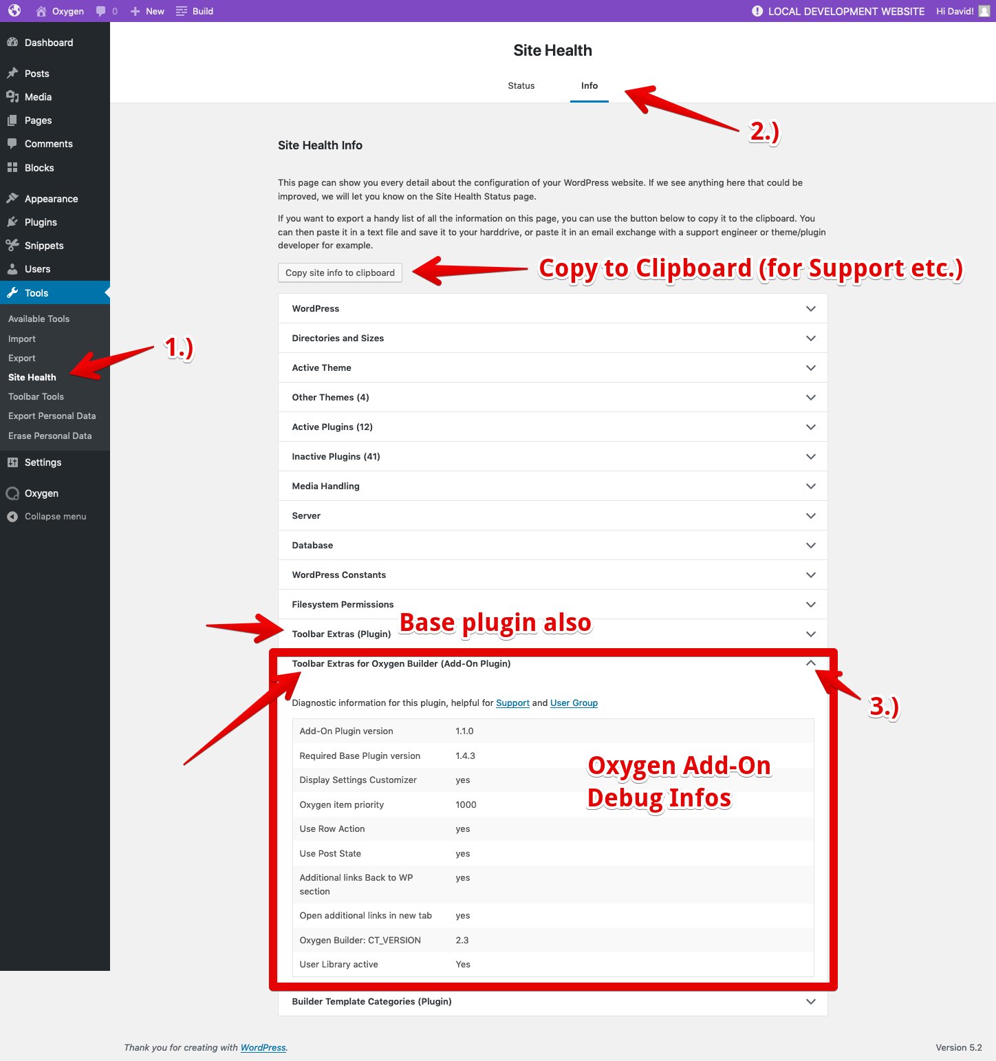 - New: Integrated with WordPress 5.2+ new Site Health feature: Toolbar Extras for Oxygen Builder now has an extra section on the Debug Info tab - this is especially helpful for support requests