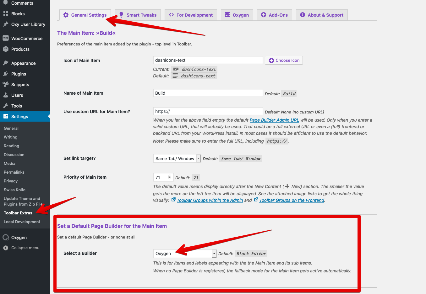 - In Toolbar Extras settings set Oxygen as your default "Page Builder", set optional background color of Toolbar etc.