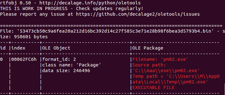 rtfobj displays a list of the OLE and Package objects that have been detected, with their attributes such as class and filename.