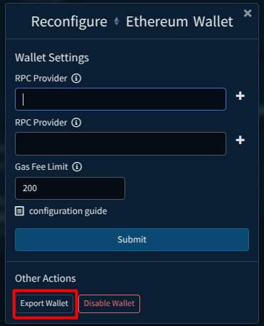 To export the wallet's private key, open the wallet settings for the receiving wallet, and click the Export Wallet button: