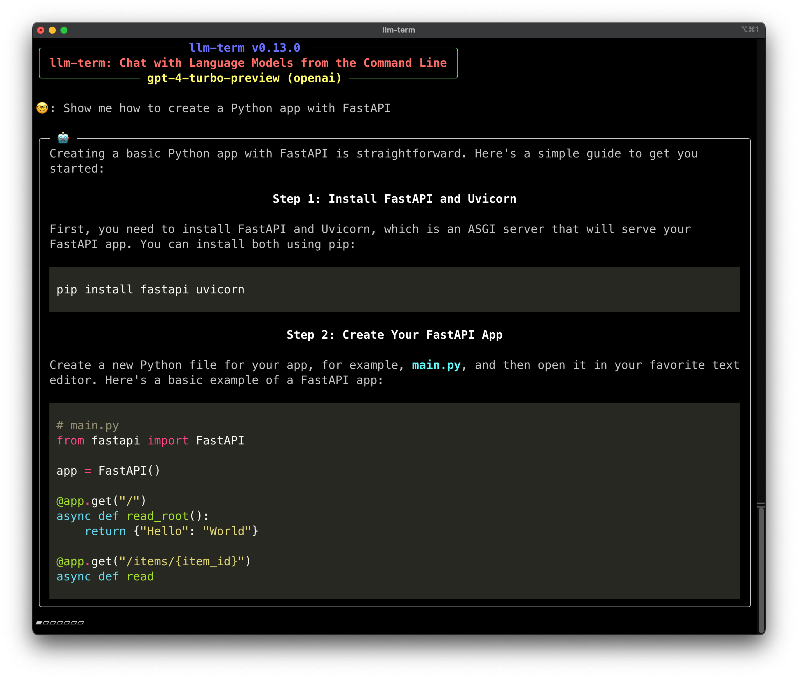 pipx install llm-termThen, you can chat with the model directly from the command line: