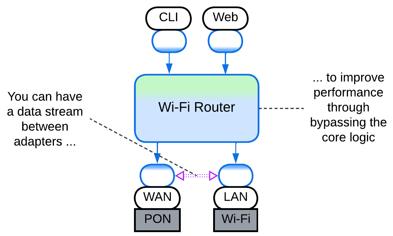 In rare cases the system may benefit from direct communication between the adapters. However, that requires several of them to be compatible or polymorphic, in which case your Hexagonal Architecture may in fact be a kind of shallow Hierarchy. Examples include a service that uses several databases which are kept in sync through Change Data Capture (CDC) or a telephony gateway that interconnects various kinds of voice devices.