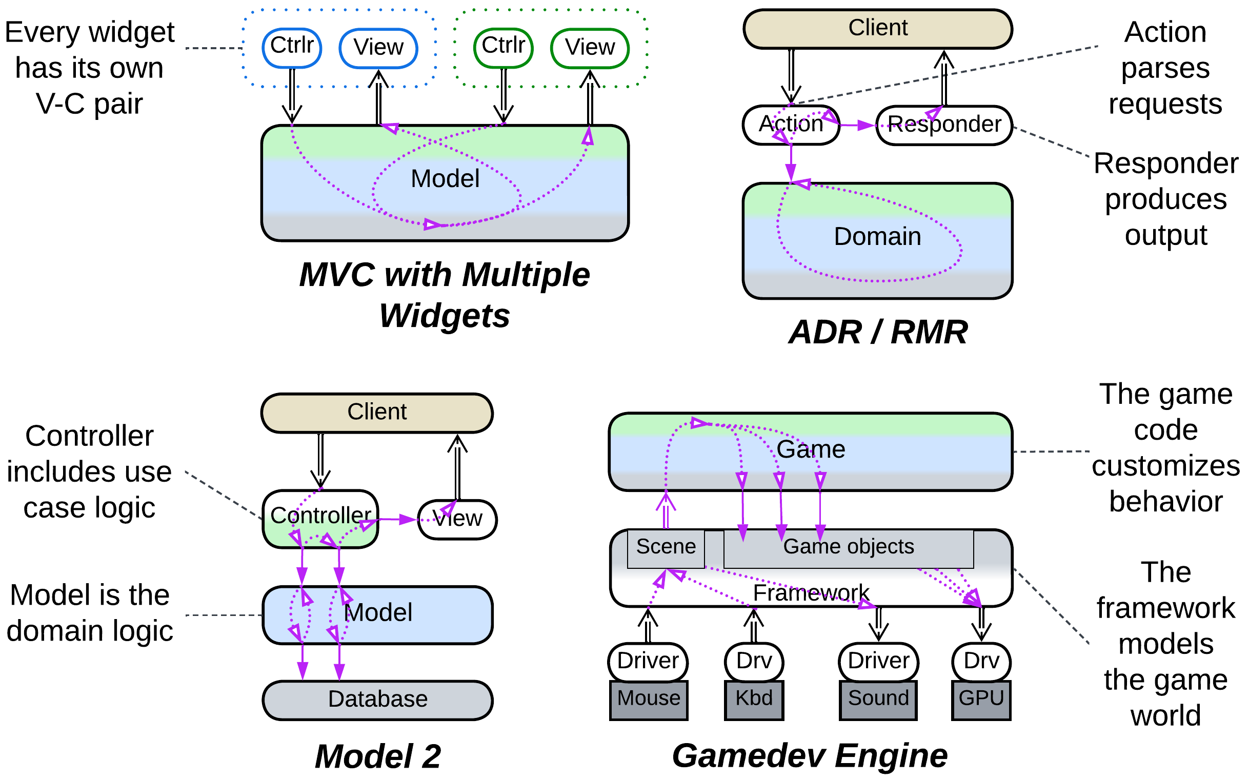 Model-View-Controller (MVC), Action-Domain-Responder (ADR), Resource-Method-Representation (RMR), Model 2 (MVC2), Game Development Engine