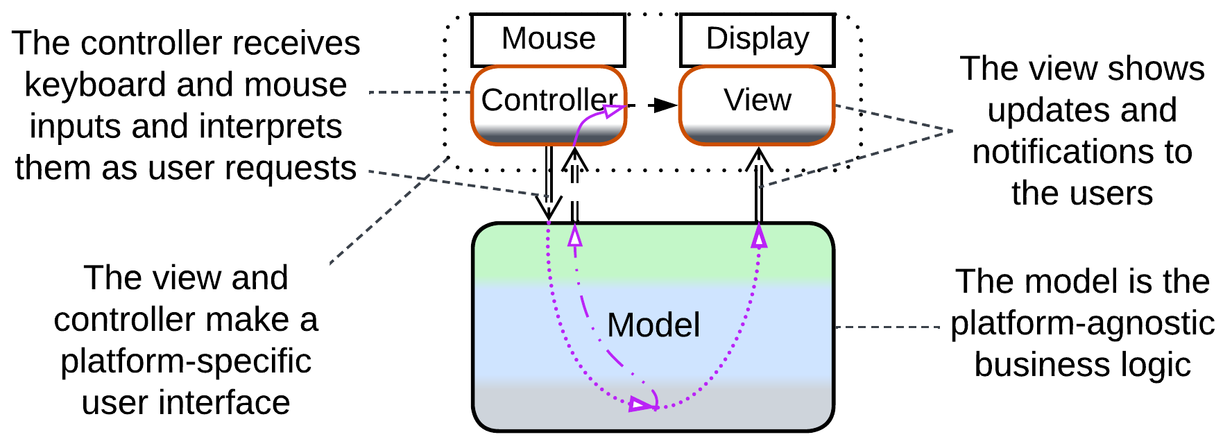 Model-View-Controller (MVC) [POSA1, POSA4] allows for cross-platform development of hand-crafted UI applications (which was necessary before universal UI frameworks emerged) by abstracting the system’s model (its main logic and data, the core of Hexagonal Architecture) from its user interface containing platform-specific controller (input) and view (output):
