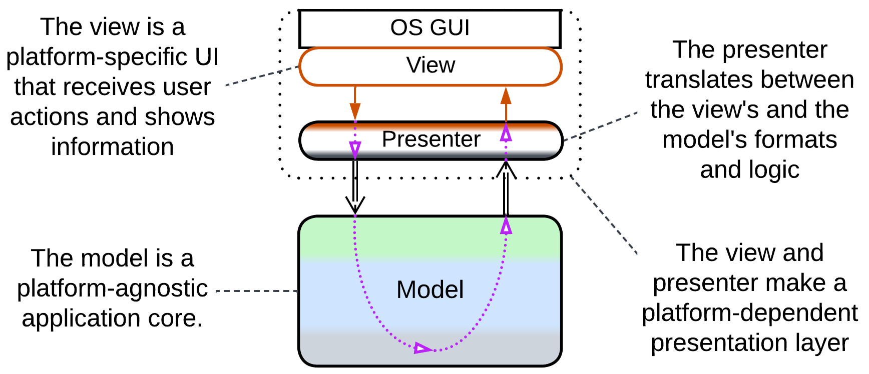 • View – the interface exposed to users. In Hexagonal Architecture’s terms it is an adapter for the OS GUI framework.