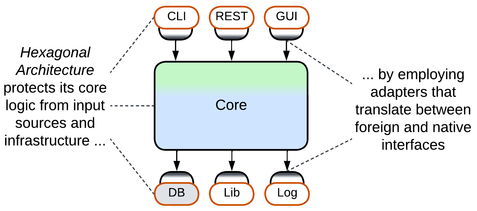 Each adapter breaks the dependency between the core that contains business logic and an adapted component. This makes all the system’s components mutually independent – and easily interchangeable and evolvable – except for the adapters themselves, which are small enough to be rewritten as need arises.