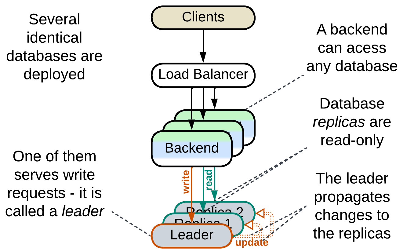 Multiple instances of the database are deployed and one of them is the leader [DDIA] instance which processes all writes to the system’s data. The changes are then replicated to the other instances (via Change Data Capture (CDC)) which are used for read requests. Distributing workload over multiple instances increases maximum read throughput which the system is capable of, as the database is usually the system’s bottleneck. Having several running replicas greatly improves reliability and allows for nearly instant recovery of database failures as any replica may quickly be promoted to the leader role to serve write traffic.