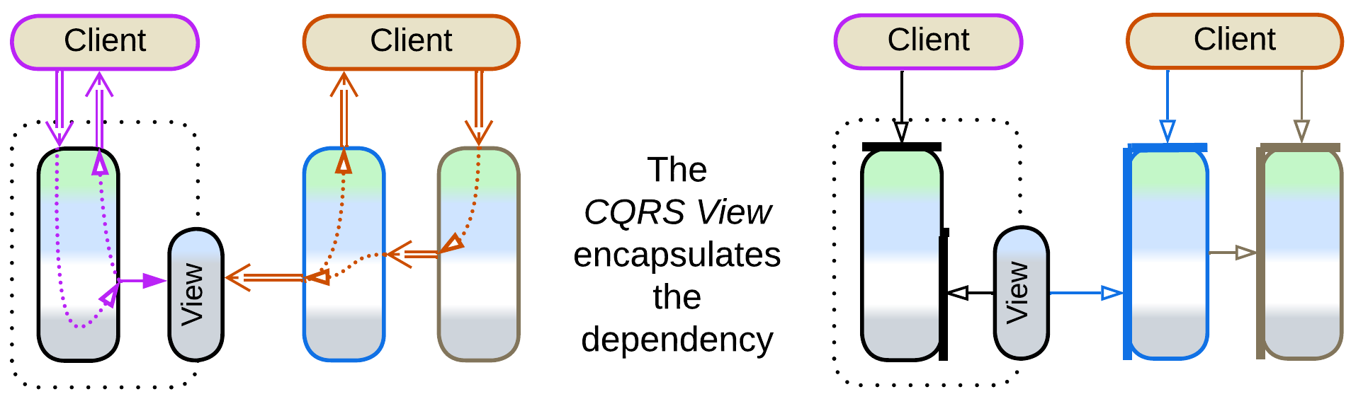 If the system relies on notifications (services publish domain events), it is possible to avoid interservice queries (pairs of a read request and confirmation with the data retrieved) by aggregating data from notifications in a CQRS (or materialized) View [MP], which can reside in memory or in a database. Views can be planted inside every service that needs data owned by other services or can be gathered into a dedicated Query Service [MP]. Though the main goal of CQRS Views is to resolve distributed joins from databases of multiple services, they also help remove dependencies in the code of services and optimize out interservice queries, simplifying APIs and improving performance. Further examples will be discussed in the chapter on Polyglot Persistence.