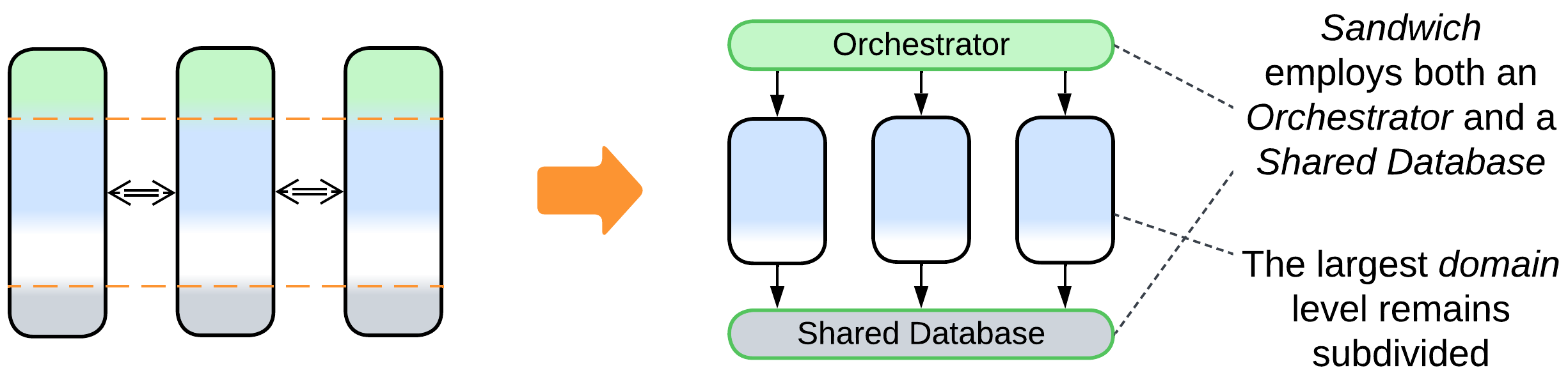 - Division by subdomain can be applied to Layers to form Sandwich (partial subdivision) or Service-Oriented Architecture (layers of services); to Proxy, Orchestrator, or API Gateway to make Backends for Frontends; to a (shared) database resulting in Polyglot Persistence.